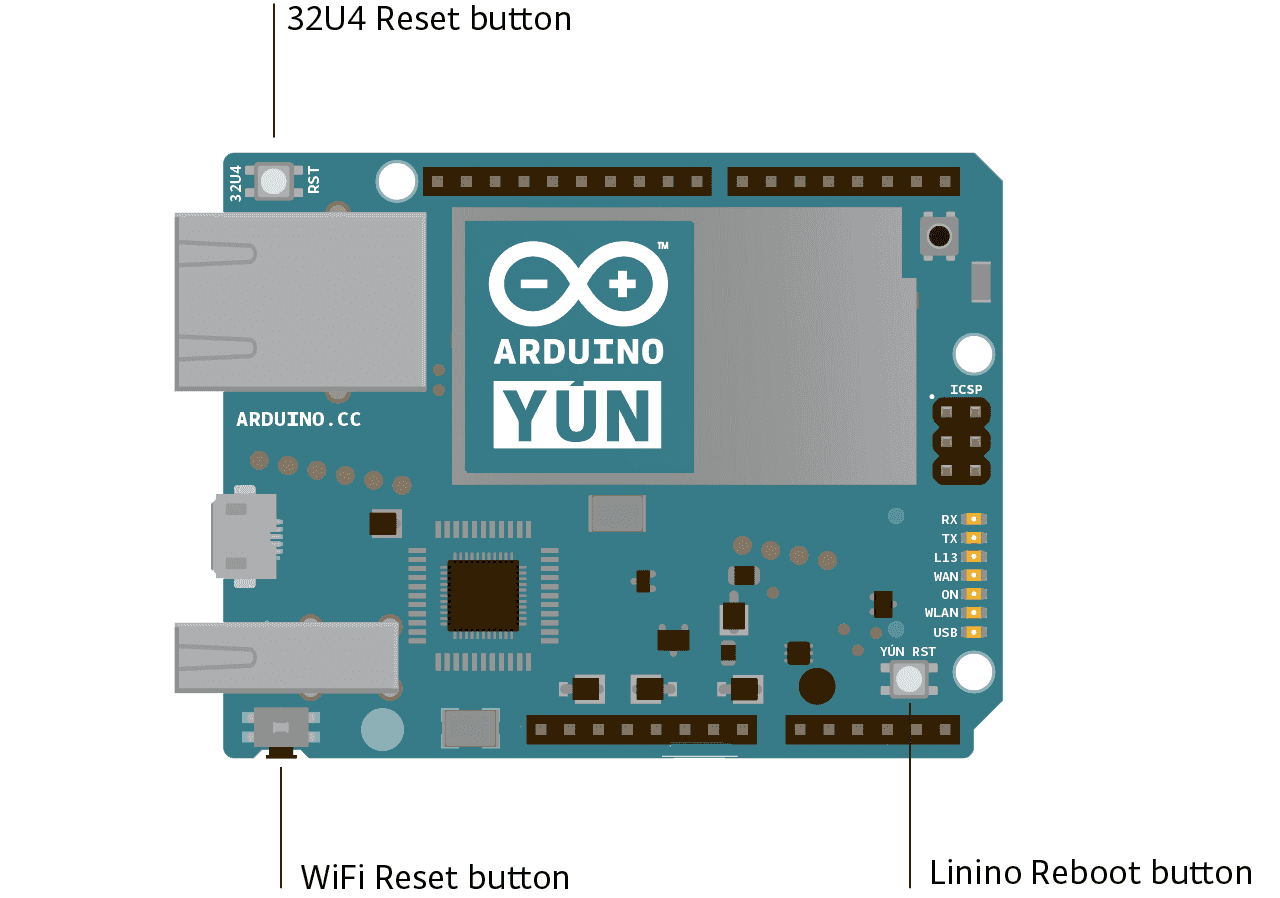 The 32u4, WiFi, and AR9331 processors all have their own reset buttons.