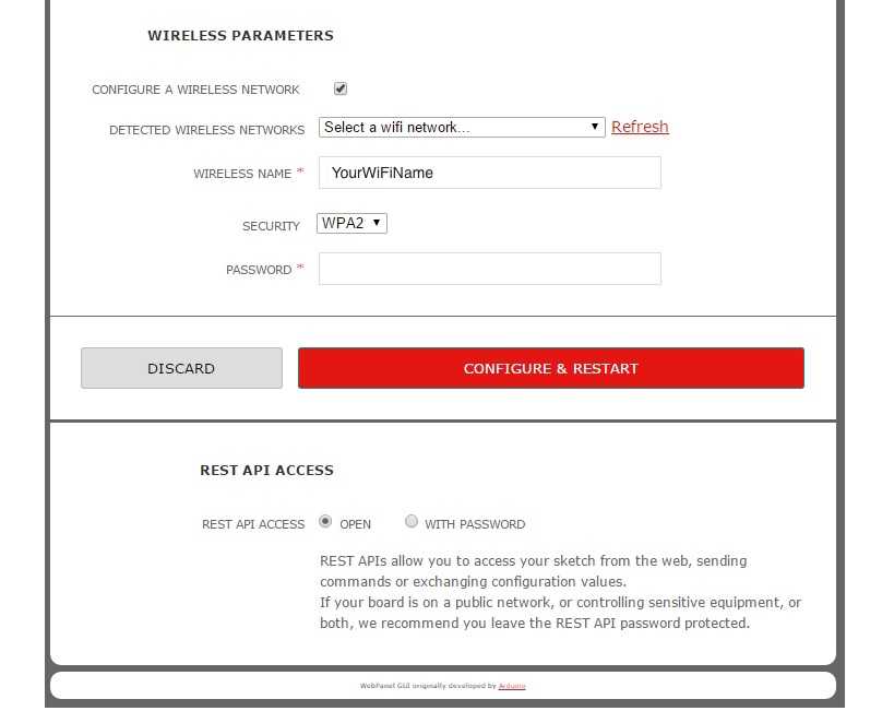 By default, the REST API access is password protected. It is possible to change this to access the services without a password. To change this setting, enter the Yún configuration panel. At the bottom of the page, you will see toggles for changing the access.