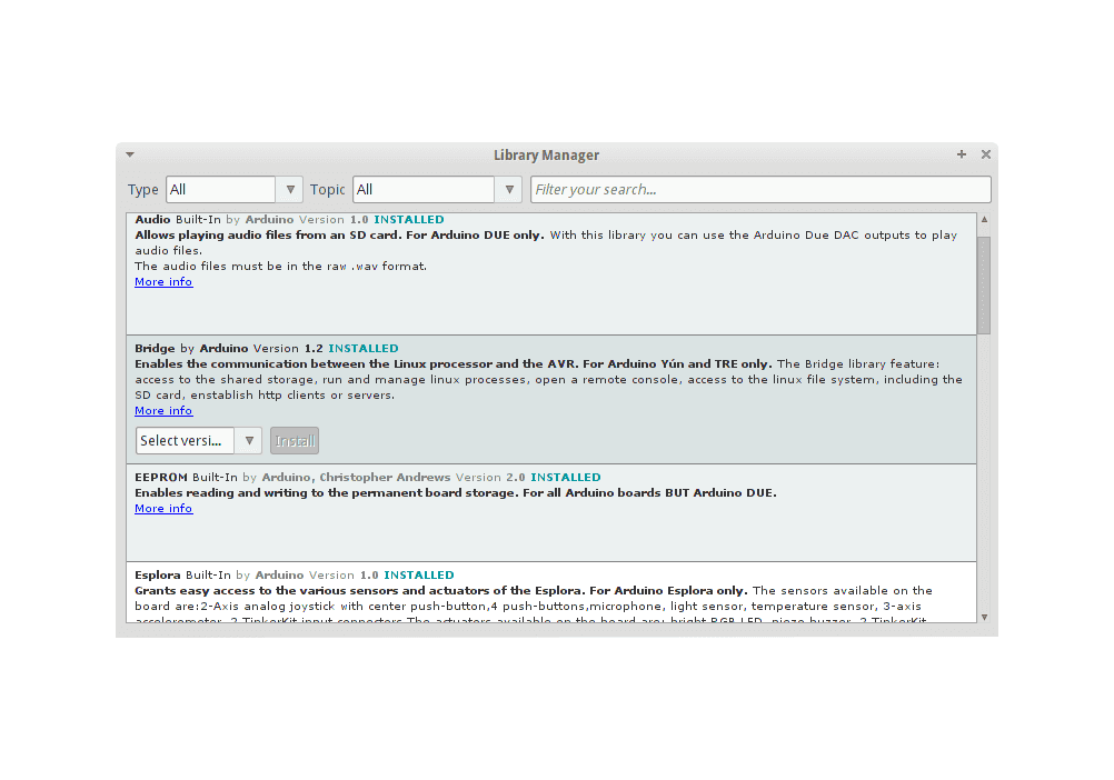 Then the Library Manager will open and you will find a list of libraries that are already installed or ready for installation. In this example we will install the Bridge library. Scroll the list to find it, click on it, then select the version of the library you want to install. Sometimes only one version of the library is available. If the version selection menu does not appear, don't worry: it is normal.