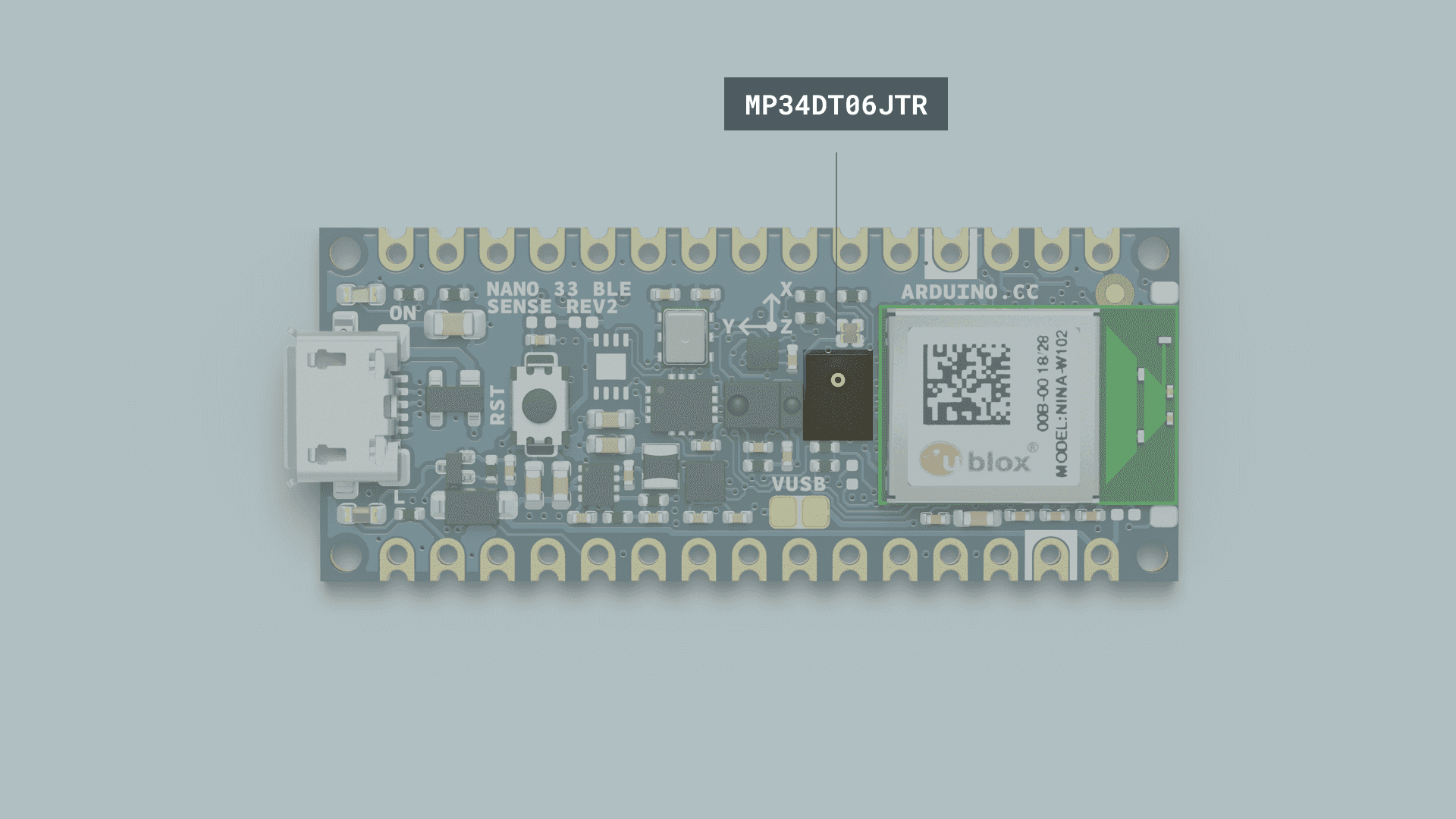 To access the data from the MP34DT06JTR, we need to use the PDM library that is included in the Arduino Mbed OS Nano Board package. If the Board Package is installed, you will find an example that works by browsing File > Examples > PDM > PDMSerialPlotter.